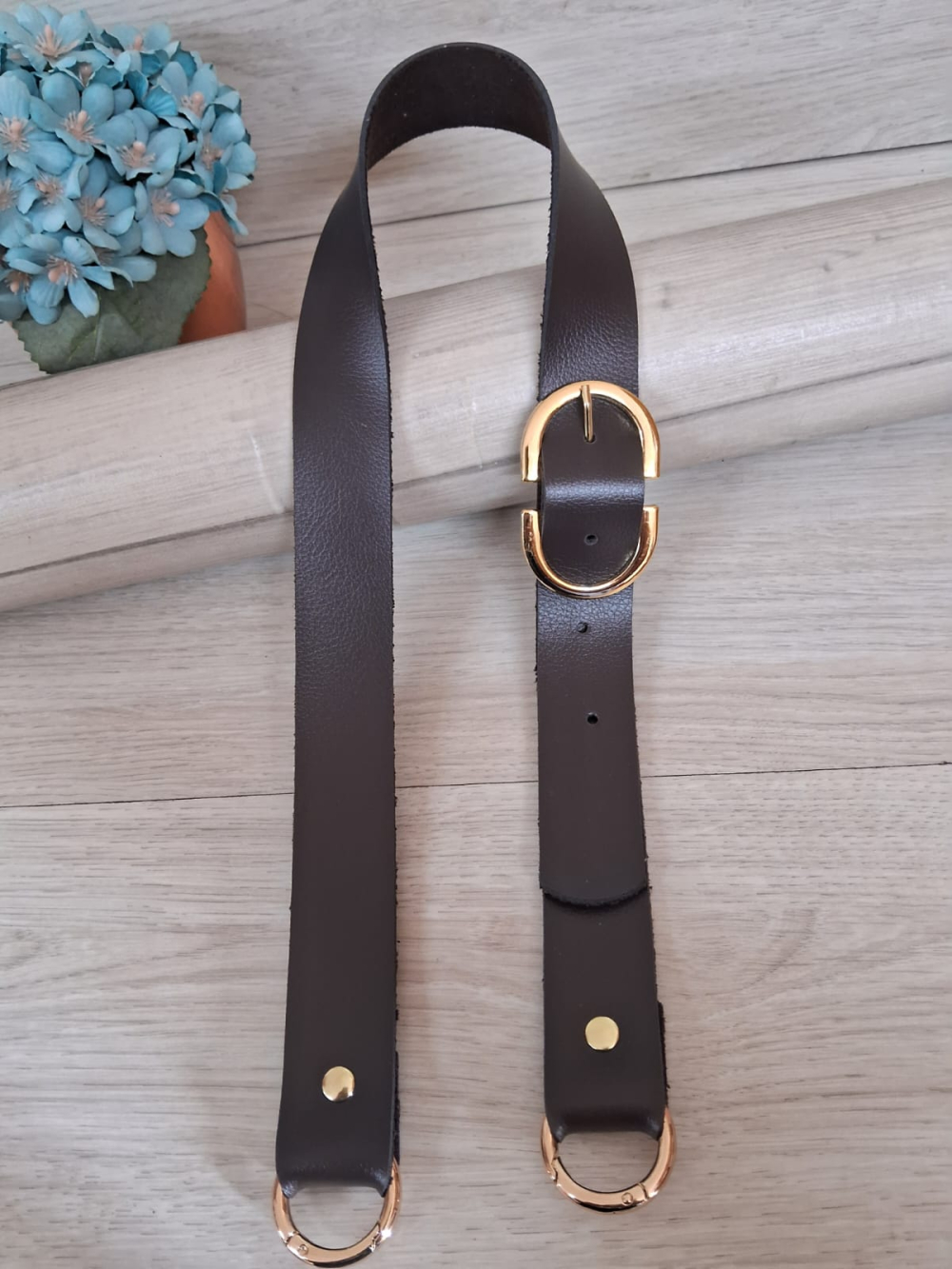 Alça de couro sintético montana com fivela de largura de 3cm e de 72cm comprimento total com argola articulada,podendo variar de 2 centímetros para mais o comprimento total o banho das ferragens é dourado