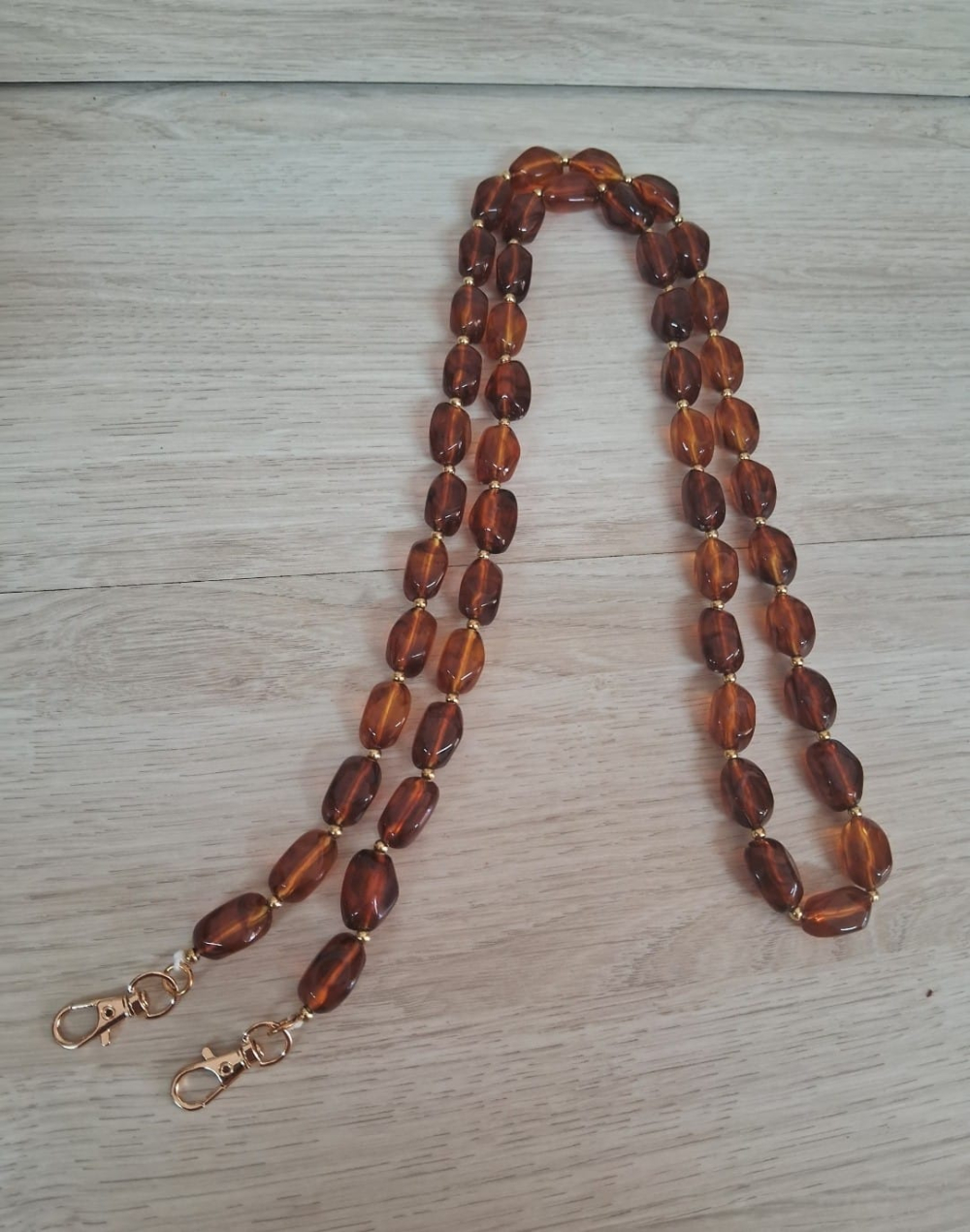 Disponível em diversas cores sofisticadas, como marrom mesclado, caramelo translúcido, bege perolado e marfim marmorizado, todas com acabamento dourado nos ganchos de metal.