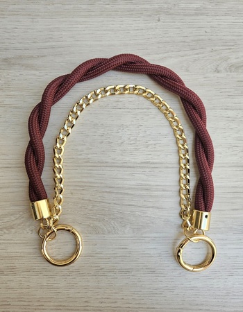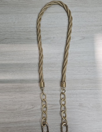 Alça de dupla de cordão náutico com corrente dourada seu comprimento é de 35cm pode variar de 2cm para mais ou menos finalizada com argola articulada nas extremidades,o banho da ferragem é dourado.