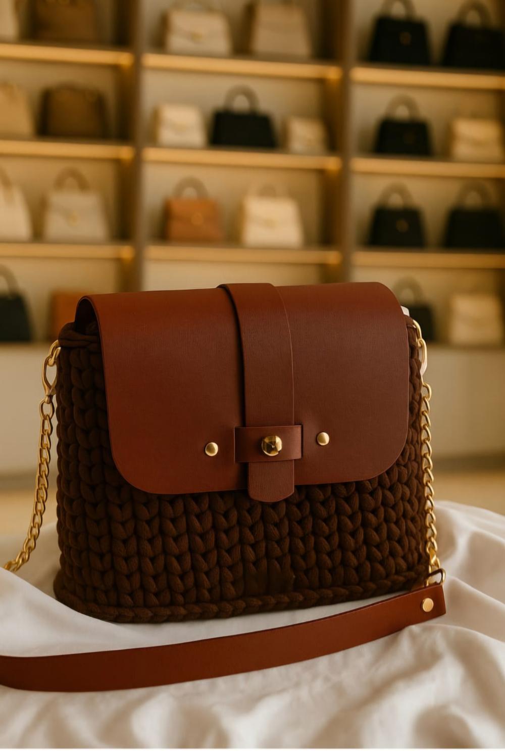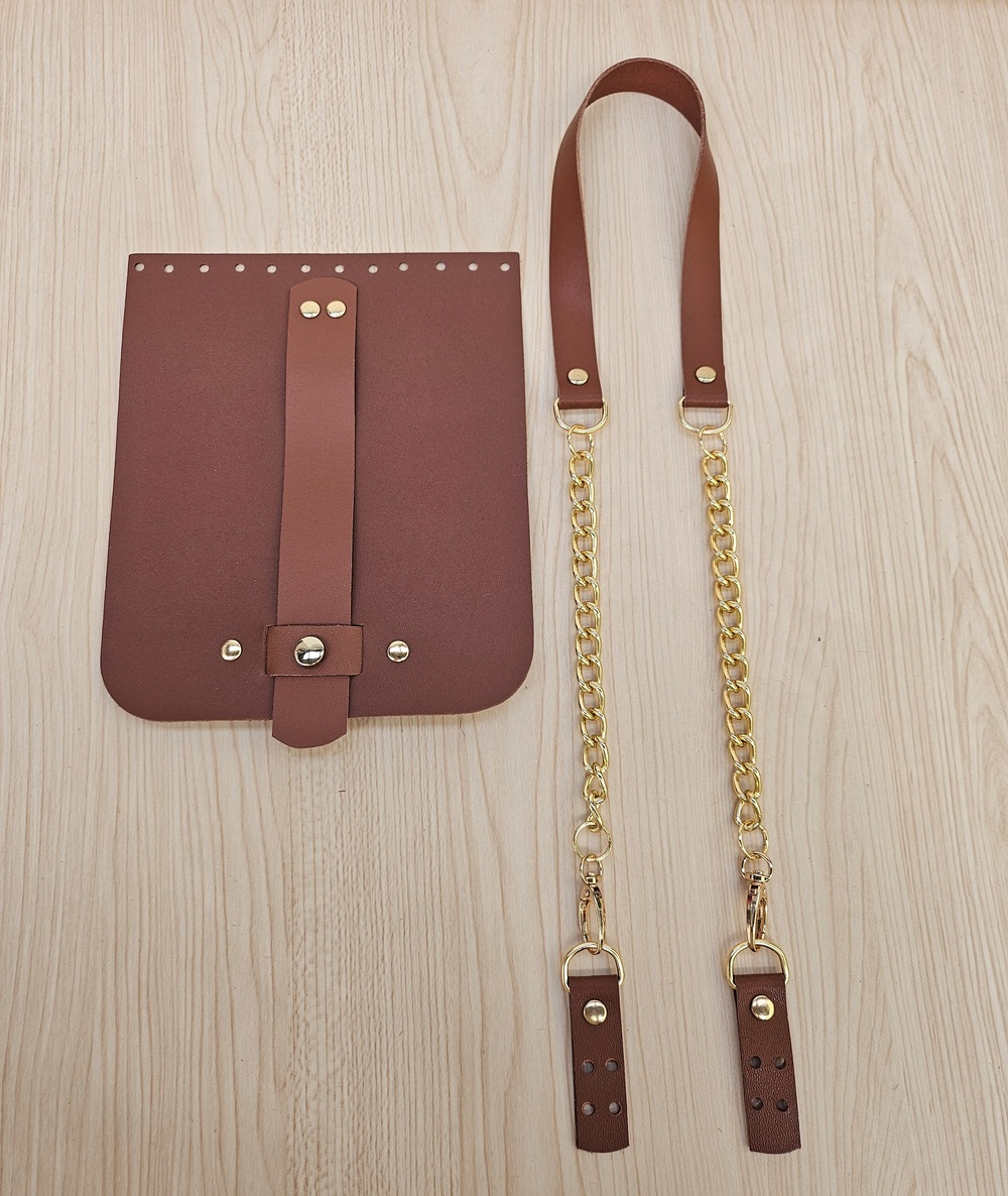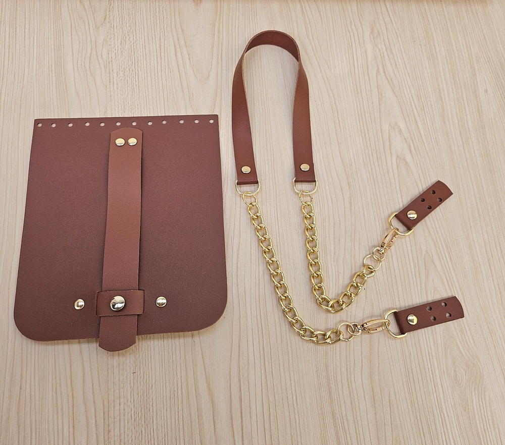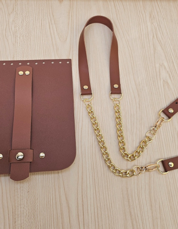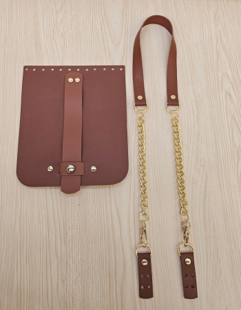 O Kit contém uma alça de couro legítimo com corrente no dourado e uma Aba de couro legítimo caramelo com botão de imã dourado.