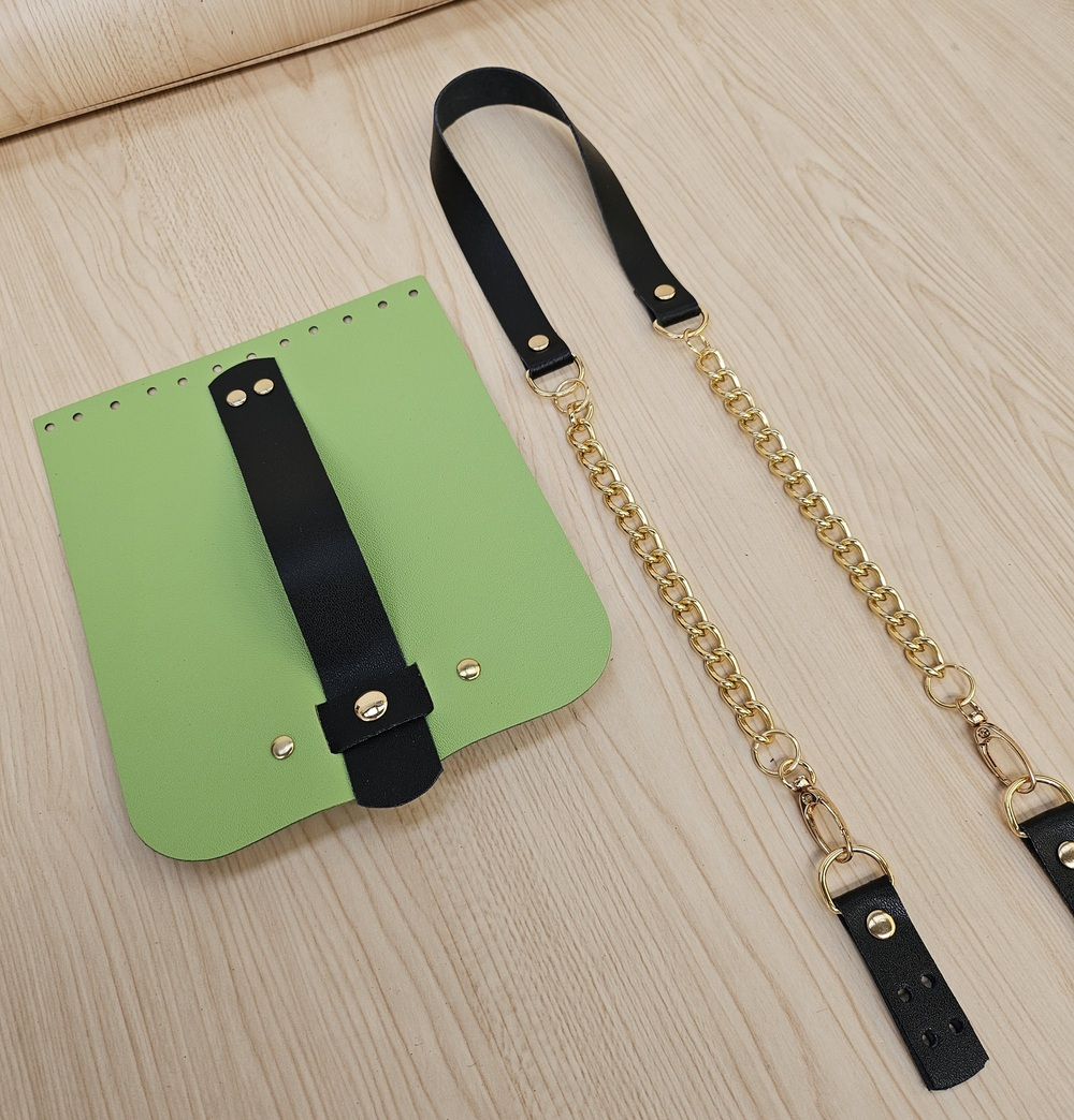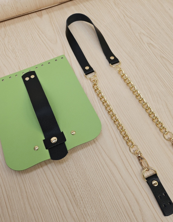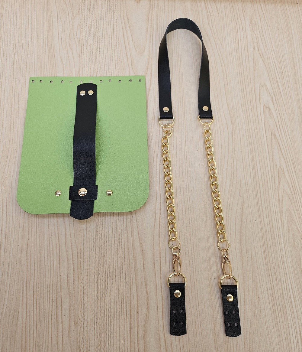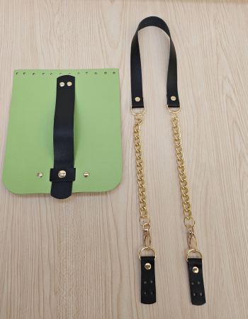 O Kit contém uma alça de couro legítimo com corrente no dourado e uma Aba de couro legítimo caramelo com botão de imã dourado.
