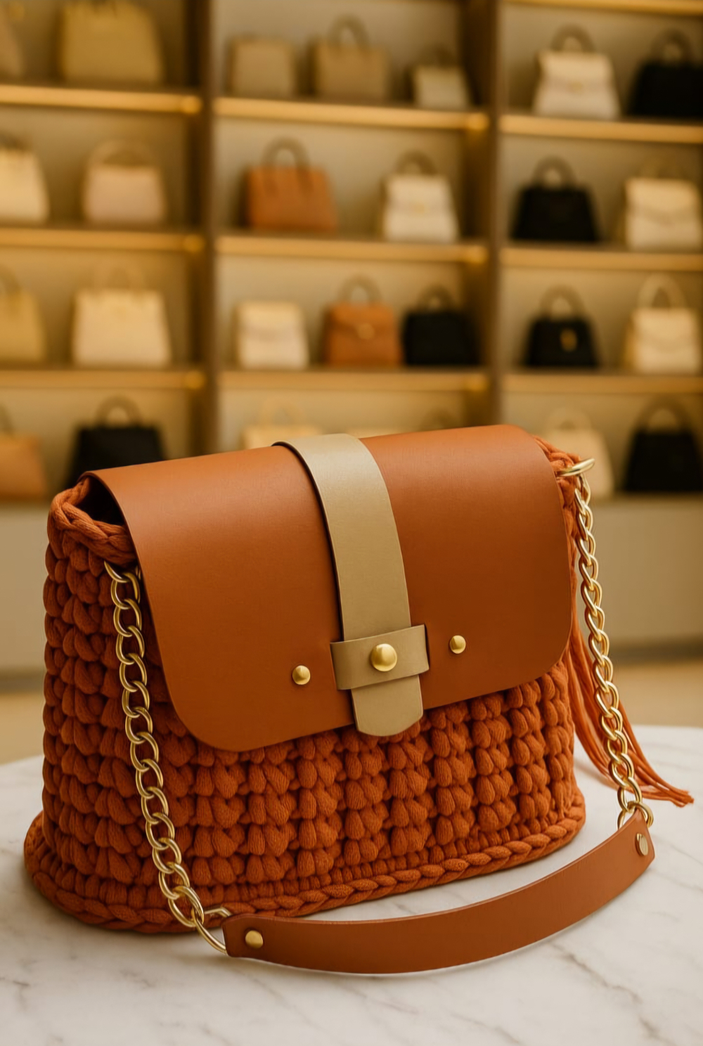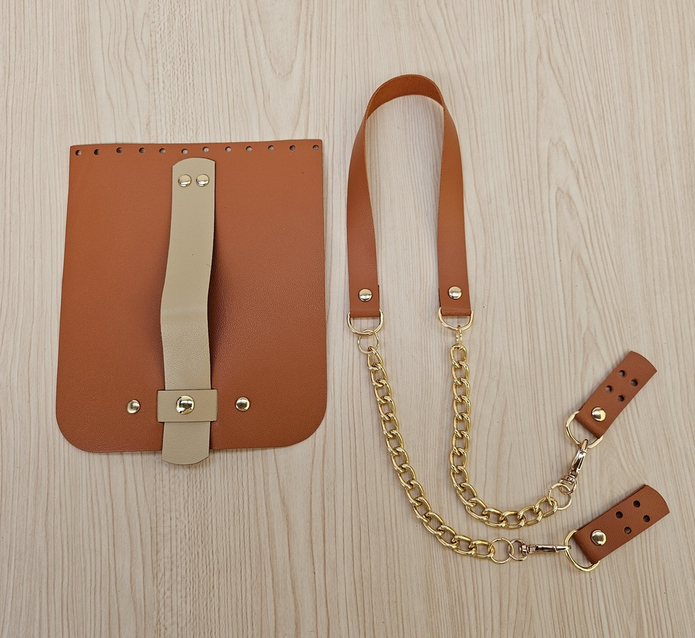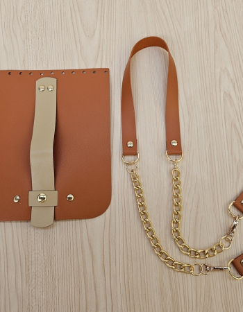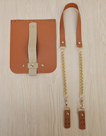 O Kit contém uma alça de couro legítimo com corrente no dourado e uma Aba de couro legítimo caramelo com botão de imã dourado.