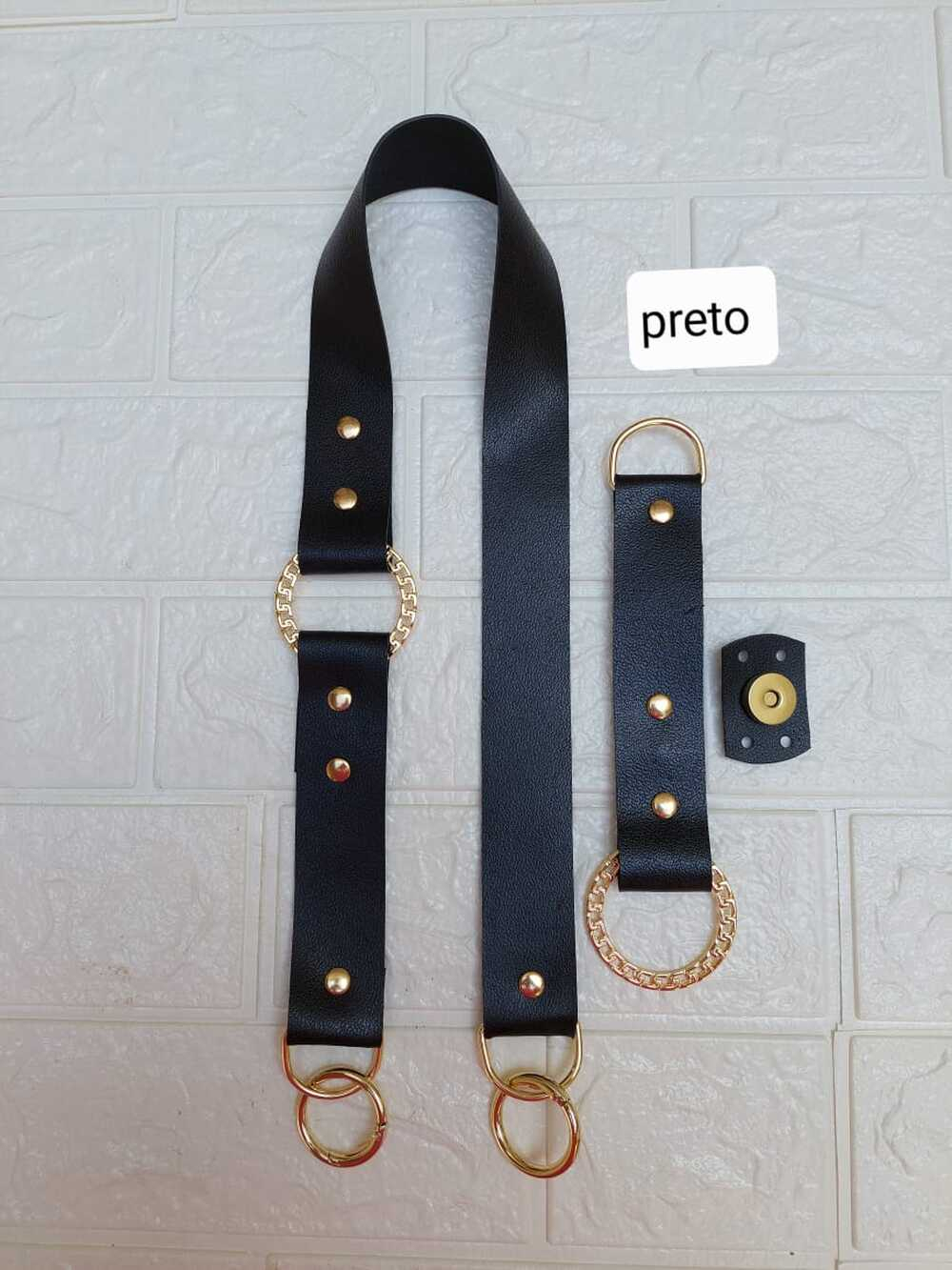 Kit composto por 1 Alça de ombro com couro legítimo e argola de metal no meio finalizado com argola articulada nas extremidades e 1 fecho de couro com argola de metal fecho de imã para costurar