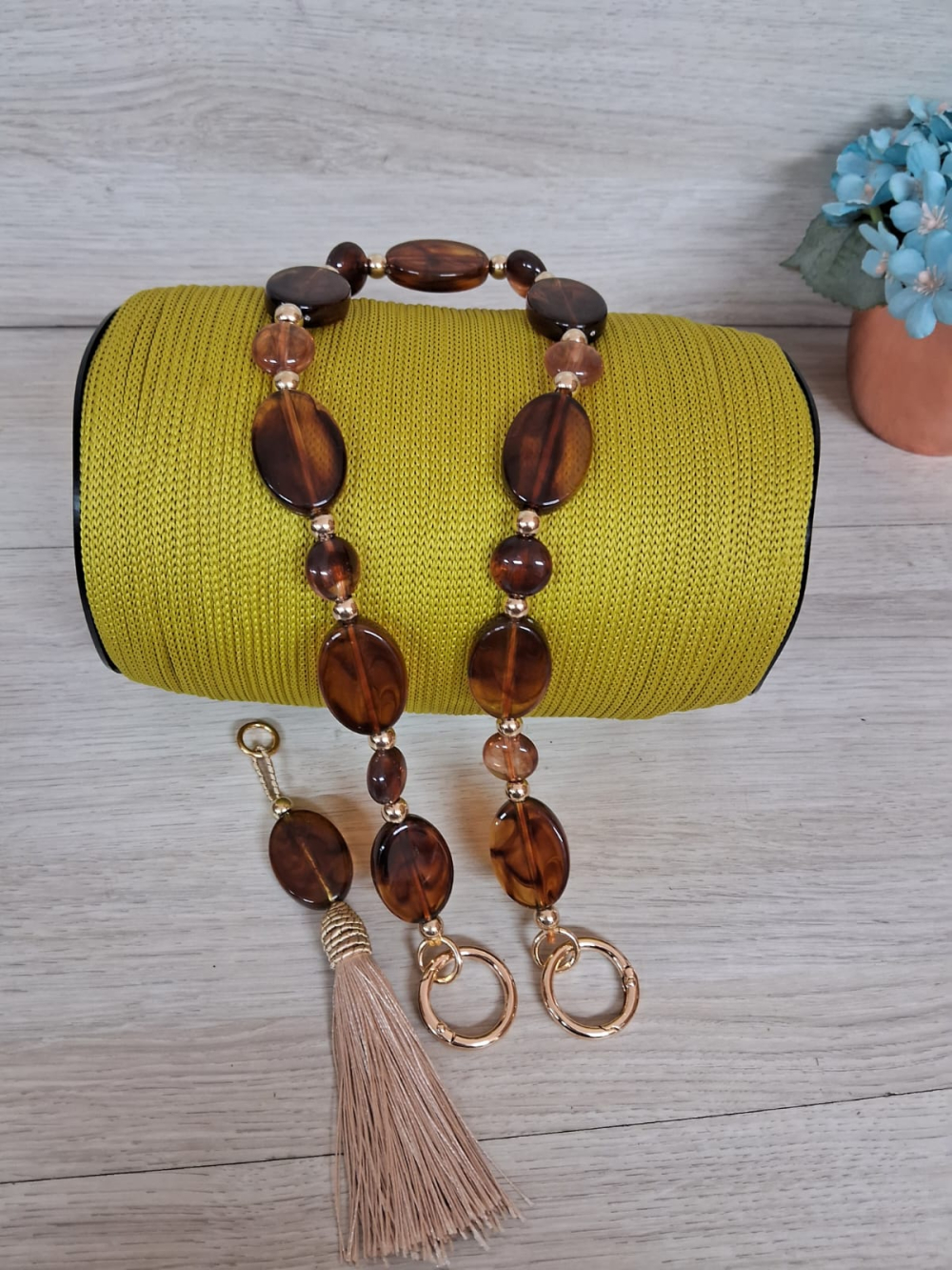 UMA ALÇA DE RESINA CARAMELO COM ARGOLA ARTICULADA BANHO DOURADO COM 62CM